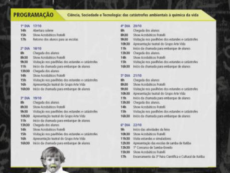 De segunda-feira à sábado, de 17 a 22 de outubro, são esperadas cerca de 15 mil pessoas para a terceira edição da Feira Científica e Cultural, promovida pela Cidade de Itatiba, segundo a assessoria do município.