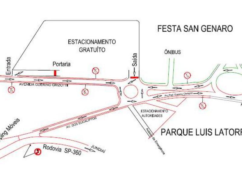 Para facilitar a ida aos shows da Festa de San Gennaro, nos dias 28, 29 e 30 de outubro, sexta, sábado e domingo, e na Festa de Aniversário da cidade na próxima terça-feira, dia 1º de novembro, será implantado um esquema especial de trânsito nas imediações do Parque Luis Latorre. A Av. Guerino Grizotti terá mão única até o Parque e para acesso ao estacionamento gratuito. A saída do Parque será pela Av. dos Eucaliptos em direção à Rodovia SP 360.