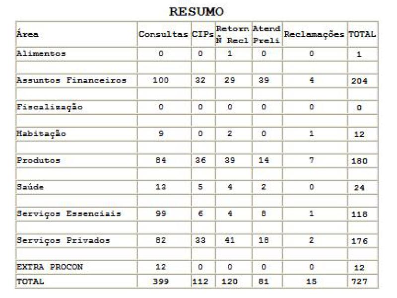 Foram emitidas 112 Cartas de Informações Preliminares (CIP) e 81 casos foram resolvidos por telefone. Foram registradas, ainda, 15 reclamações com a designação de audiências e 120 CIPs foram arquivadas com aproximadamente 60% dos casos solucionados.