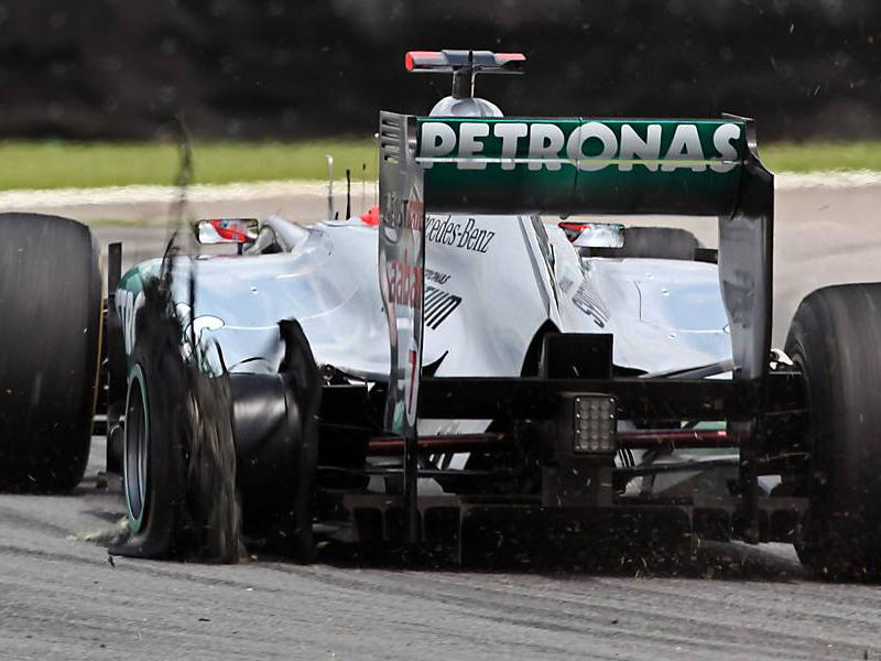 Numa tentativa de defender a posição, Bruno Senna tocou o bico da asa dianteira na roda esquerda traseira do rival. Schumacher levou o carro com o pneu furado até a área dos boxes. Já o piloto da Renault continuou na pista (parou três voltas depois) sem grandes avarias no carro, mas foi punido com um drive-through.