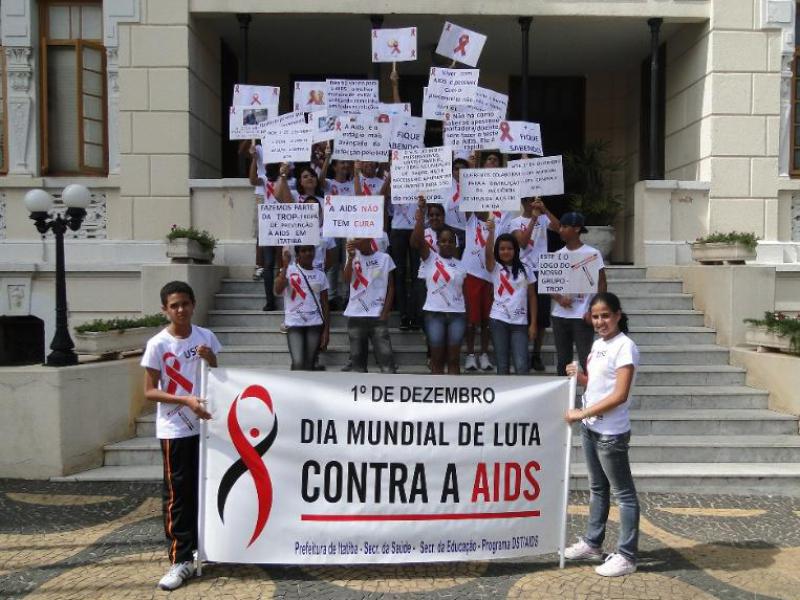 caminhadas pelo centro da cidade levando cartazes informativos sobre o HIV e a importância dos métodos de prevenção.