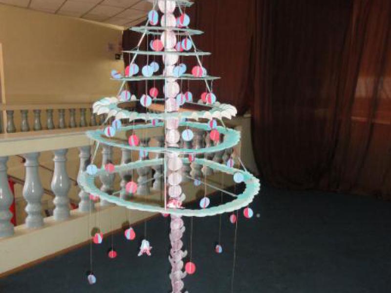 4º Lugar - Rosana e Flávia – Árvore depapelão e coador de café, com anjos de jornal