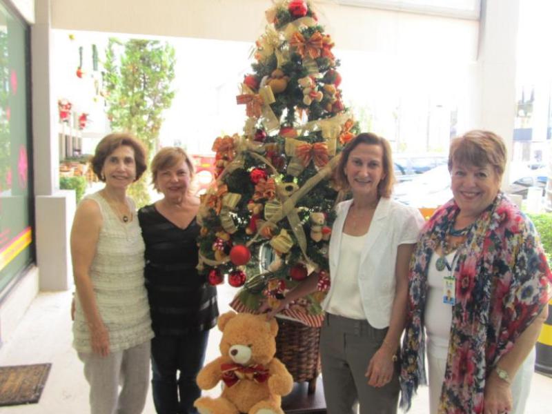 Regina Helena Scavone, Wanda Gava, colaboradoras e organizadoras do Bazar Solidário, entregam a árvore de Natal à Elza Momentel Padovani, junto com a funcionária do FSS Vera Helena Brick