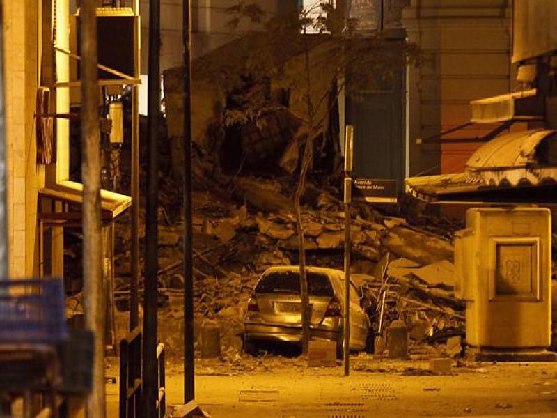 Os três prédios localizados ao lado do Theatro Municipal desabaram por volta das 20h30. O teatro não foi atingido, mas seu anexo, onde funciona a bilheteria, sofreu danos por causa dos escombros.