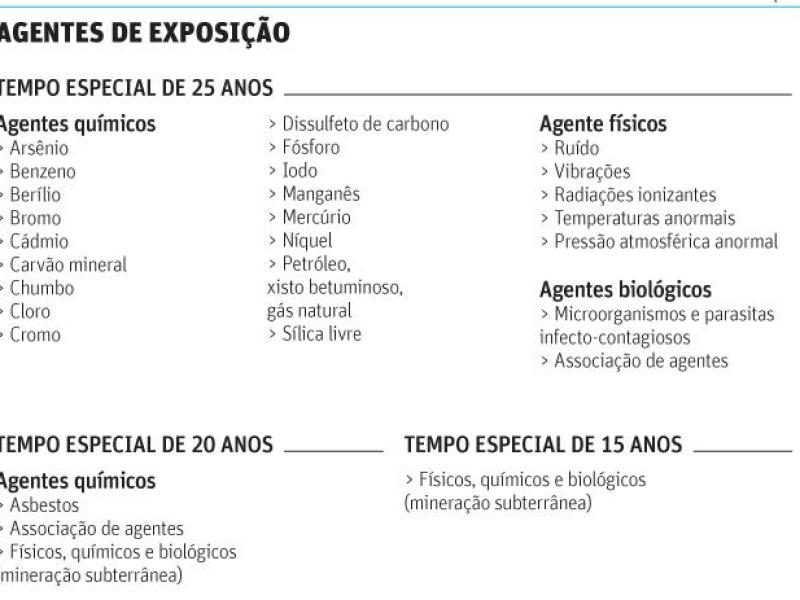 Assim, hoje o que define o tempo de contribuição que o segurado deverá ter para se aposentar de forma especial é a lista de agentes nocivos da Previdência, que informa o tempo de trabalho para cada atividade e agente.