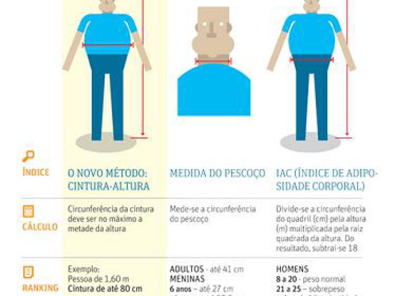 O índice de massa corporal é calculado dividindo o peso em quilos pela altura, em metros, ao quadrado. A conta sugerida pela pesquisa da médica Margaret Ashwell, da Universidade Oxford Brookes, é ainda mais fácil: a circunferência da cintura deve ser, no máximo, a metade da altura. Se uma pessoa tiver 1,60 m de altura, sua cintura deve ter até 80 cm. Mais do que isso é sinal de risco.