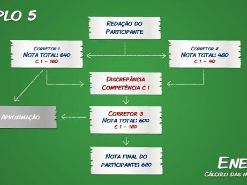 Na prova deste ano, dois corretores, a princípio, olham a redação do candidato. Se a diferença entre a nota final deles for superior a 200 pontos na nota total ou de 80 pontos em cada uma das competências, um terceiro corretor entra em cena. A nota final será a média aritmética simples das menções “mais próximas”.