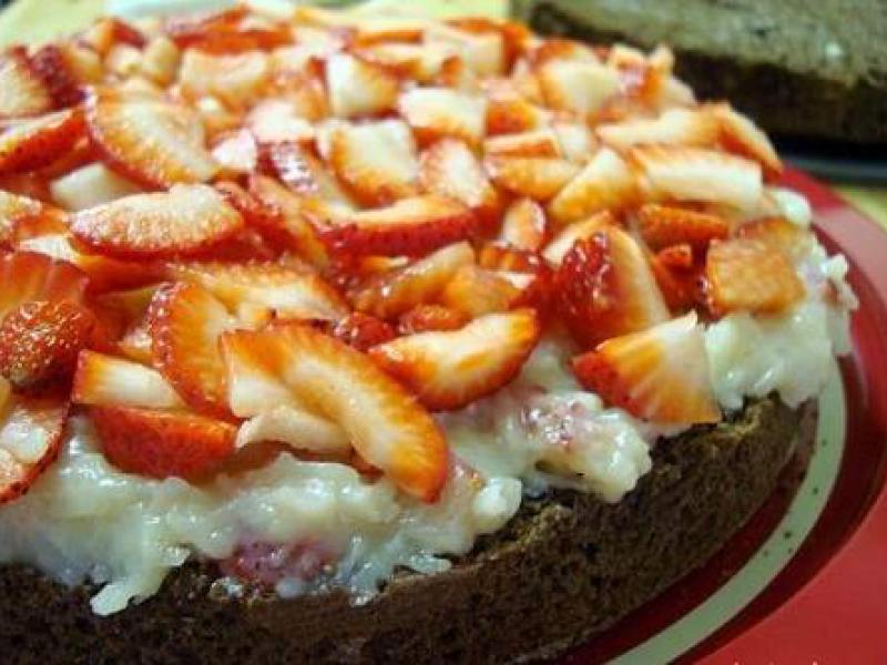 • Depois de assar o bolo, deixe esfriar, retire-o da forma e corte-o no sentido transversal. Molhe as duas partes do bolo com a calda. Acrescente o recheio e os morangos sobre uma das partes.