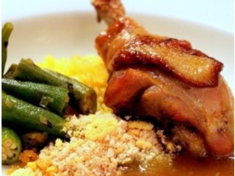 Sirva o arroz acompanhado da galinha, do quiabo, do pirão e de farofa de sua preferência.