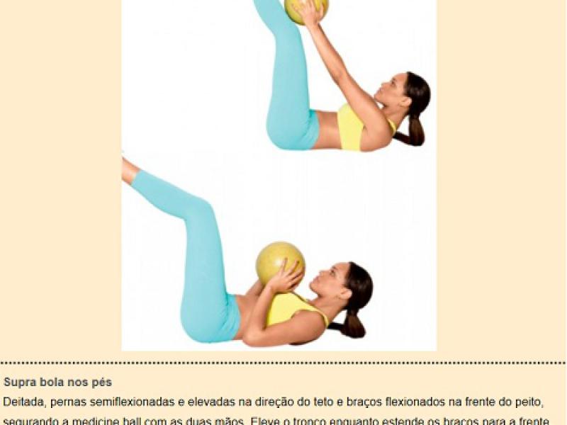 Deitada, pernas ¬flexionadas, calcanhares apoiados no chão e braços ¬flexionados, segurando a medicine ball na altura da testa. Eleve o tronco e f¬lexione ainda mais as pernas, até abraçá-las. Volte à posição inicial sem apoiar os ombros no chão.