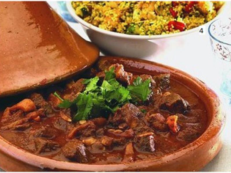 Na cidade existem cerca de 100 barracas de comida que enchem a praça principal, Djemaa el Fna. Lá é possível saborear cordeiro assado com cuscuz, berinjela, kebabs, harira (sopa de tomate e grão de bico com especiarias) e tagine (carnes e legumes cozidos em um prato de cerâmica - foto).