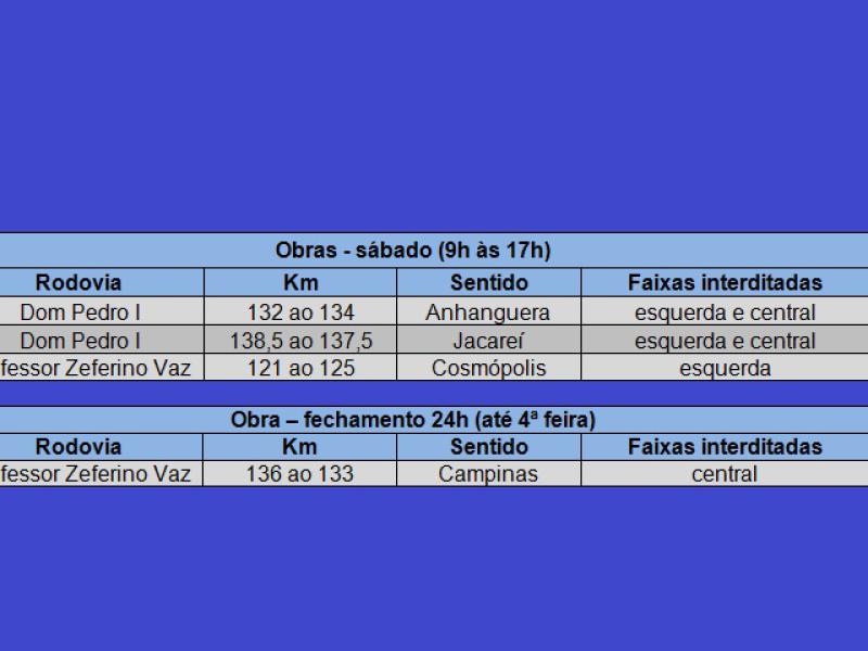 Na rodovia Dom Pedro I, na pista norte, sentido Anhanguera, o trabalho de microrrevestimento ocorre nas faixas esquerda e central entre os kms 132 (shopping Galleria) e 134 (altura do Carrefour). Na pista contrária, sentido Jacareí, as equipes farão a fresagem (troca do asfalto) das faixas da esquerda e central entre os kms 138,5 e 137,5 (em frente ao shopping Parque Dom Pedro). O horário de interdição será das 9 às 17 horas. No domingo as pistas estarão liberadas.