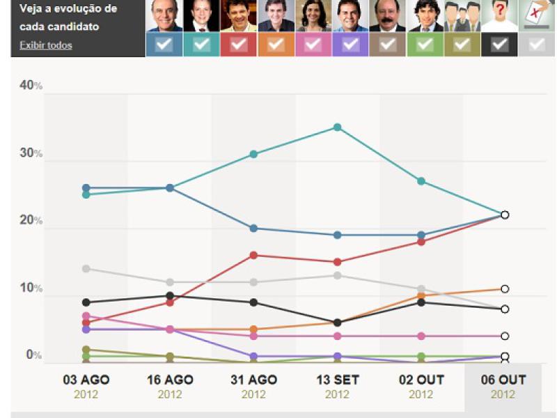Na pesquisa Ibope divulgada também na noite deste sábado (6) há um empate numérico entre Serra, Russomanno e Haddad --todos com 22%. De acordo com o instituto, "empate triplo na véspera da eleição traz indefinição sobre quem disputará o segundo turno em São Paulo".