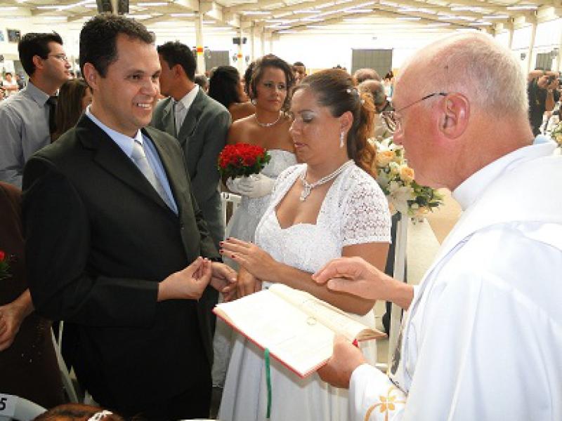 O pavilhão da FOB – Federação Ornitológica do Brasil foi todo enfeitado para receber os 66 casais participantes do Casamento Comunitário. Vinte e três casais se uniram no civil, 29 no Religioso Católico e 14 no Religioso Evangélico. Teve até casamento em Libras. Marcos Vinícius dos Santos Gomes, 28 anos, Rio de Janeiro, e Estela Elvira Gaspar Gomes, 37 anos, Beija-Flor, se conheceram no Rio de Janeiro, em um trabalho social de uma associação de surdos. “Ela gostava muito de teatro, piada e a gente começou a se conhecer, se aproximar. Ela não queria, mas eu fui tentando. Aí a gente começou a se olhar, namorar e isso já faz sete anos”, conta Marcos. Radiante, o noivo elogiou e agradeceu: “Eu não sabia desse trabalho... Fui me informar e gostei muito. Em um casamento particular o custo é muito alto, dessa forma ajuda bastante... Isto é um presente de Deus em nossas vidas”, disse o noivo.
