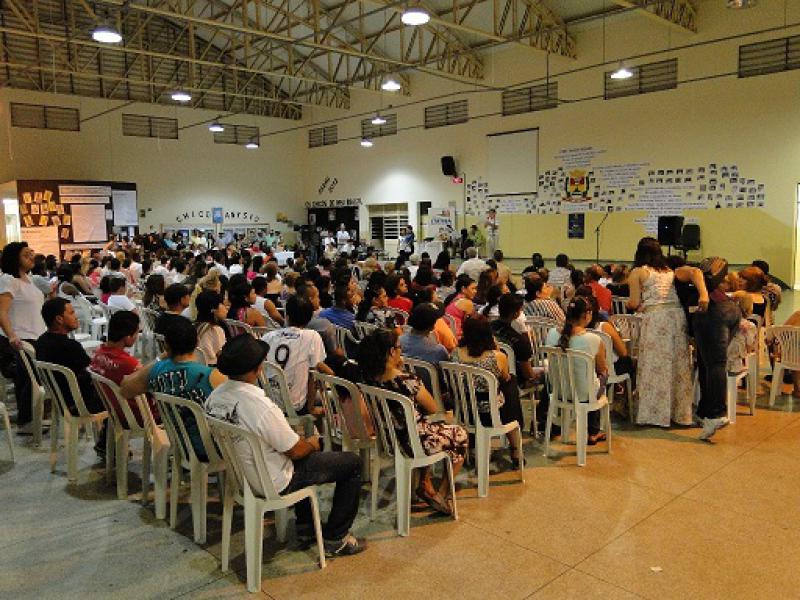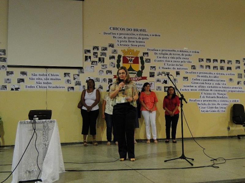 A quarta apresentação foi da Emeb ‘Profa. Nazareth de Siqueira Rangel Barbosa’, que utilizou projeção de imagens, leitura de textos e teatro para propor uma reflexão sobre os valores da sociedade atual, a partir da obra de Chico Anysio e da história de Chico Mendes.