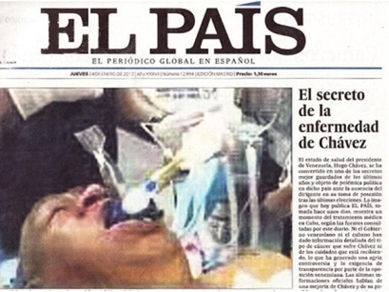 O jornal espanhol El País divulgou uma nota em seu site informando que suspendeu na quinta-feira, 24 de janeiro, a distribuição de sua edição impressa por ter publicado uma foto falsa do presidente da Venezuela, Hugo Chávez. Na imagem, que foi fornecida ao periódico por uma agência de notícias, aparecia um homem sem cabelo, entubado em uma cama de hospital. A foto permaneceu no site do jornal por cerca de meia hora.