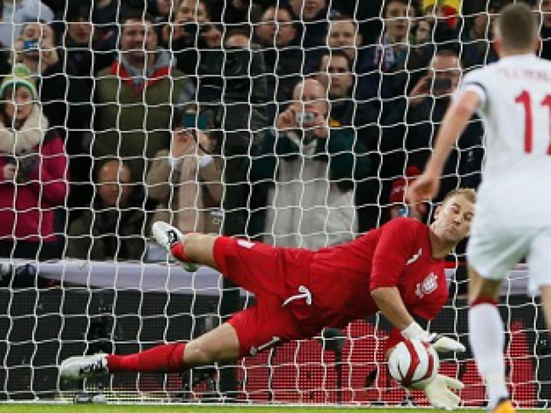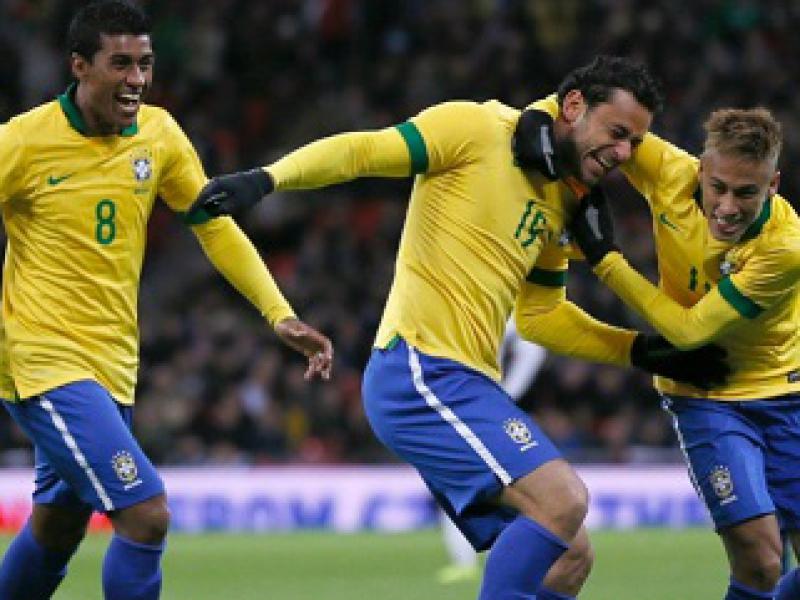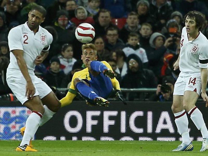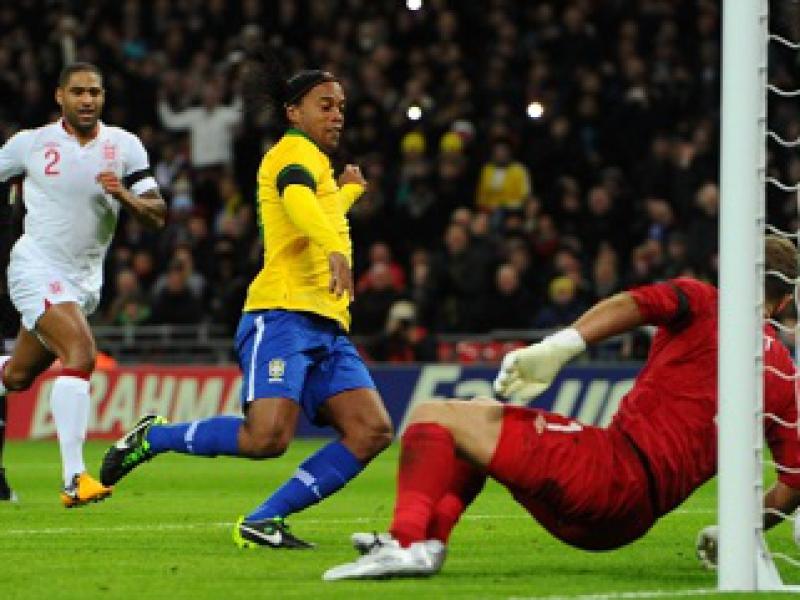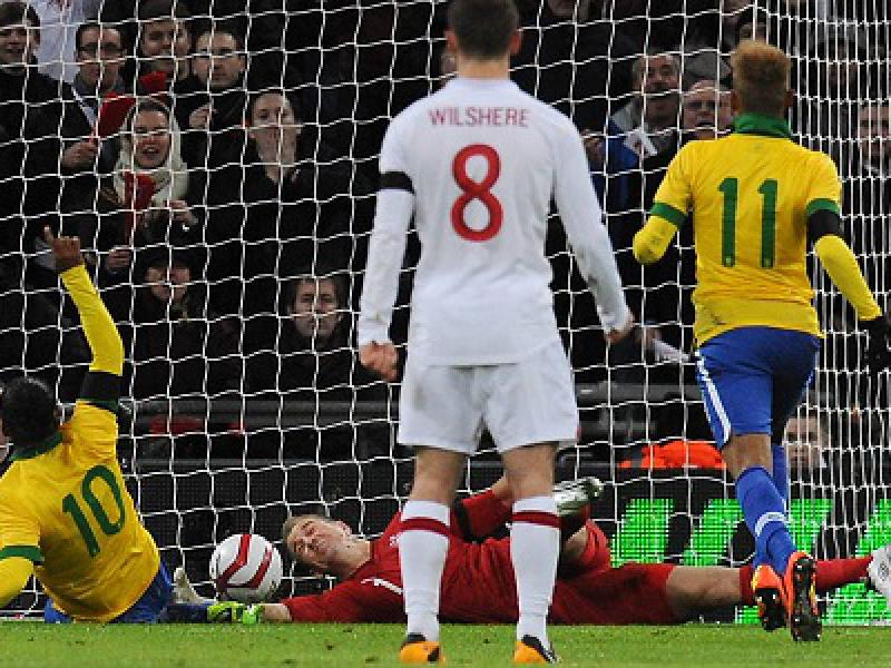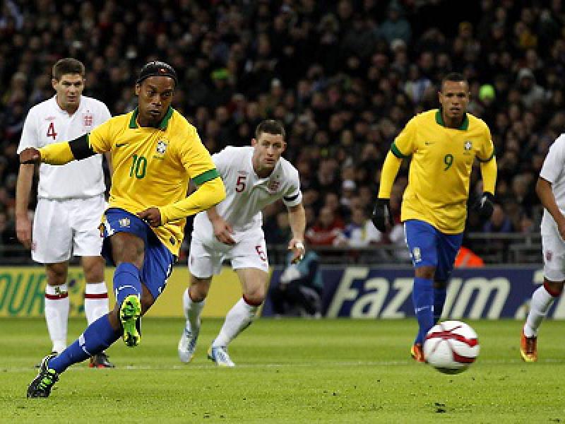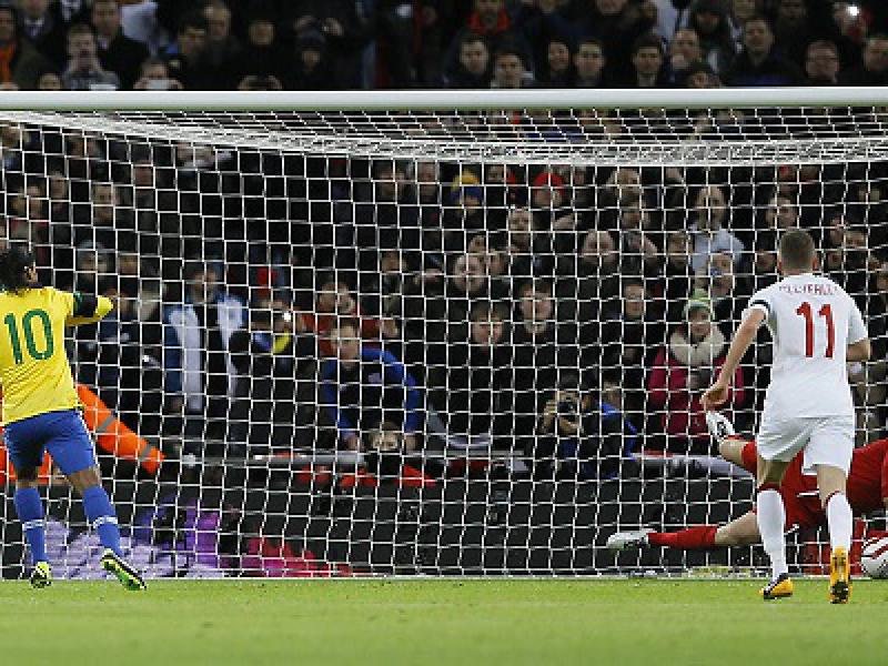 Apesar da leveza das duas equipes, a partida começou truncada. Até que aos 17min, o árbitro português Pedro Proença assinalou pênalti para o Brasil. Ele viu um toque de braço de Wilshere em um cruzamento de Ronaldinho na área.