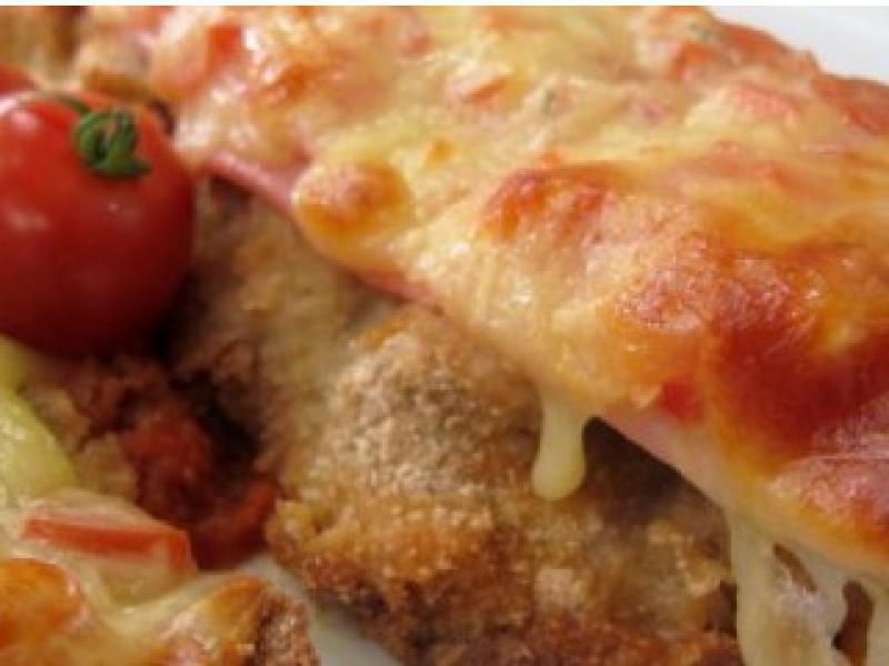 Retire a assadeira do forno e sobre cada bife coloque uma fatia de presunto, uma porção de tomate picado (reservado acima) e 2 fatias de muçarela. Leve a assadeira novamente ao forno por 10 minutos até derreter o queijo. Retire do forno e sirva em seguida. (Fonte: Encaminhado por João Bosco)