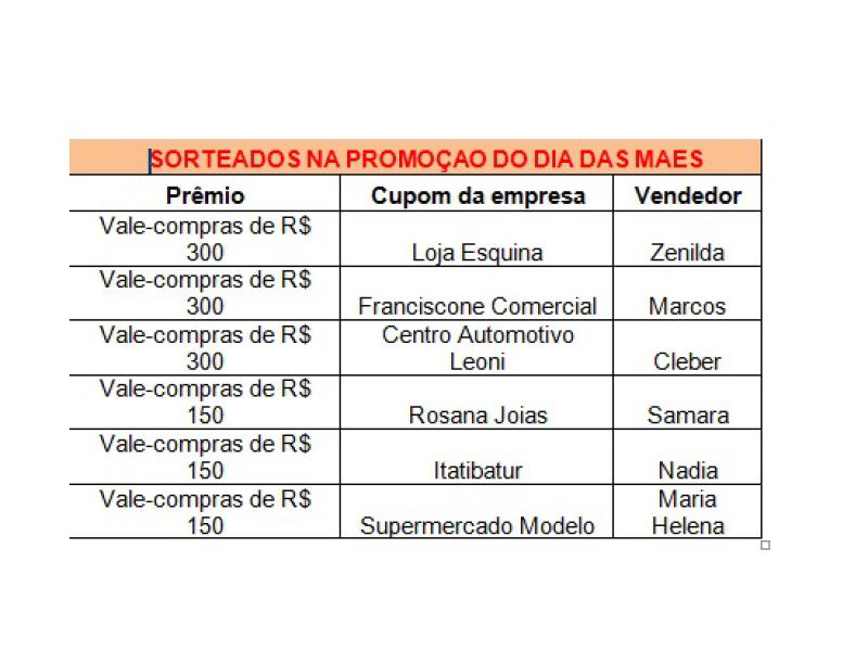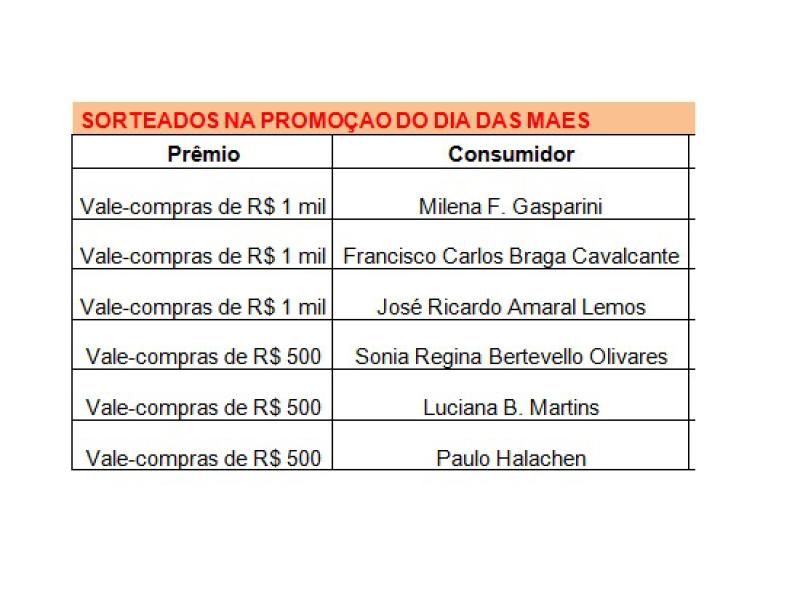 Segundo a assessoria da entidade, "Somente hoje foram sorteados quase R$ 6 mil. Os ganhadores dos vale-compras de R$ 1 mil foram: Milena F. Gasparini (Jardim de Lucca), Francisco Carlos Braga Cavalcante (Moenda) e José Ricardo Amaral Lemos (Centro). Eles fizeram suas compras na Loja Esquina, Franciscone Comercial e Centro Automotivo Leoni, respectivamente. Assim, os vendedores destas lojas também levam um lave-compras de R$ 300. São eles: Zenilda, Marcos e Cleber.
