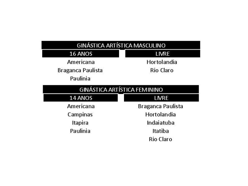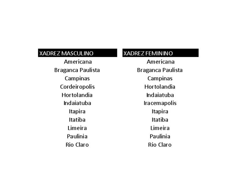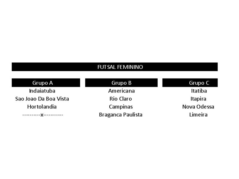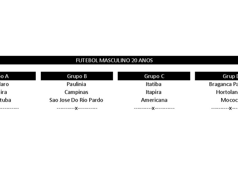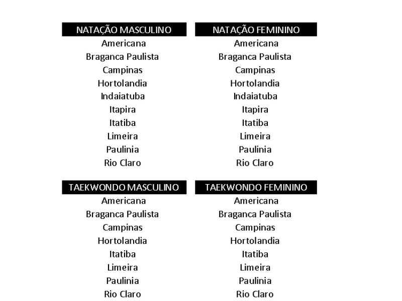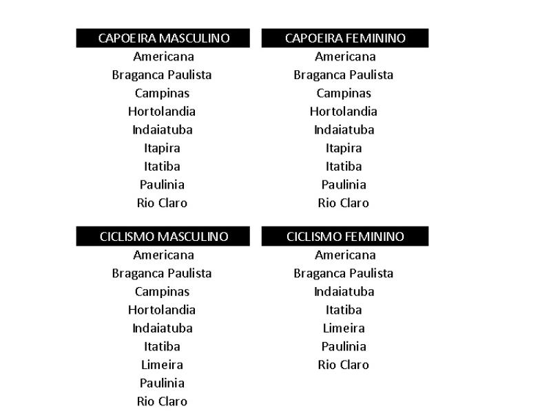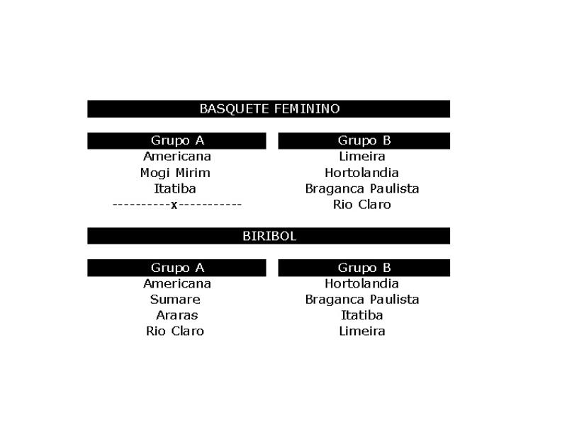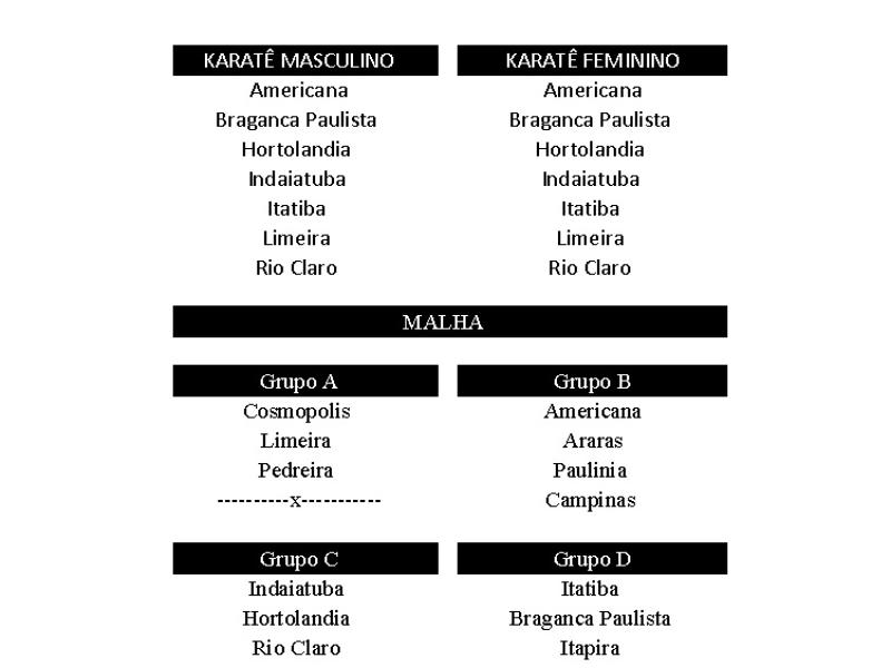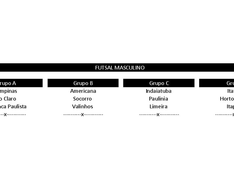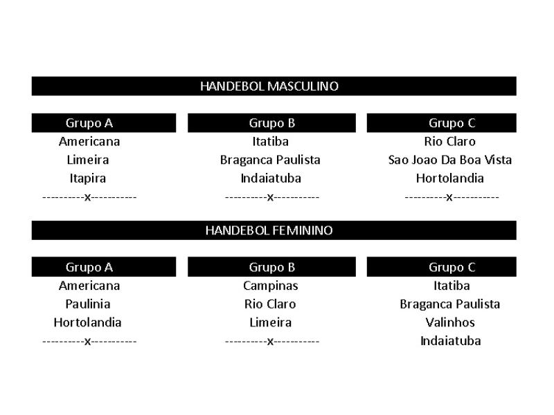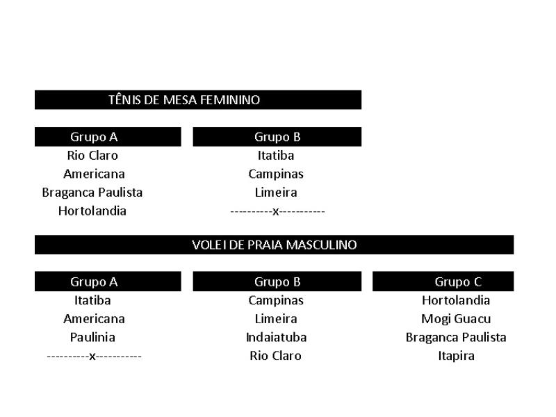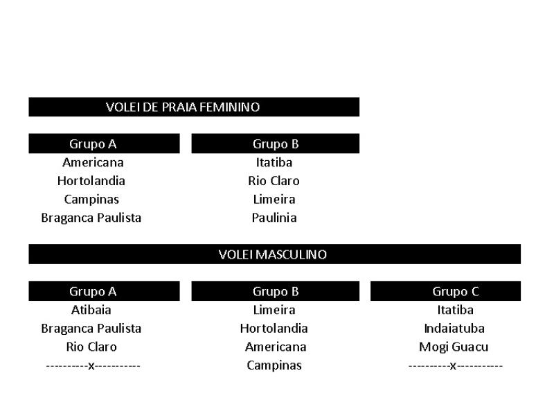 Após a solenidade de abertura aconteceu o sorteio das modalidades. Em seguida, houve o sorteio dos grupos de disputas entre as cidades participantes, divididos por modalidade. Confira na tabela clicando nas fotos logo abaixo.