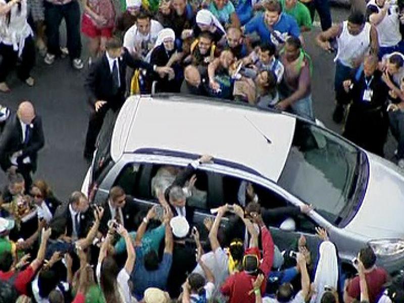 Em sua chegada ao Palácio da Guanabara, após ouvir o discurso da presidente Dilma Rousseff, o papa Francisco fez seu primeiro discurso no país, e em português.