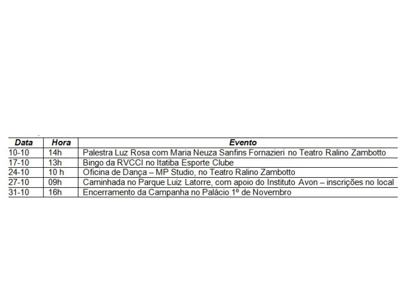 A Câmara Municipal, em parceria com a Rede de Voluntárias de Combate ao Câncer de Itatiba promove na tarde desta quinta-feira, 10 outubro, às 14h, a palestra Luz Rosa com Maria Neuza Sanfins Fornazieri, voluntária capacitada e efetiva da UNANCCAM e do grupo Rosa e Amor