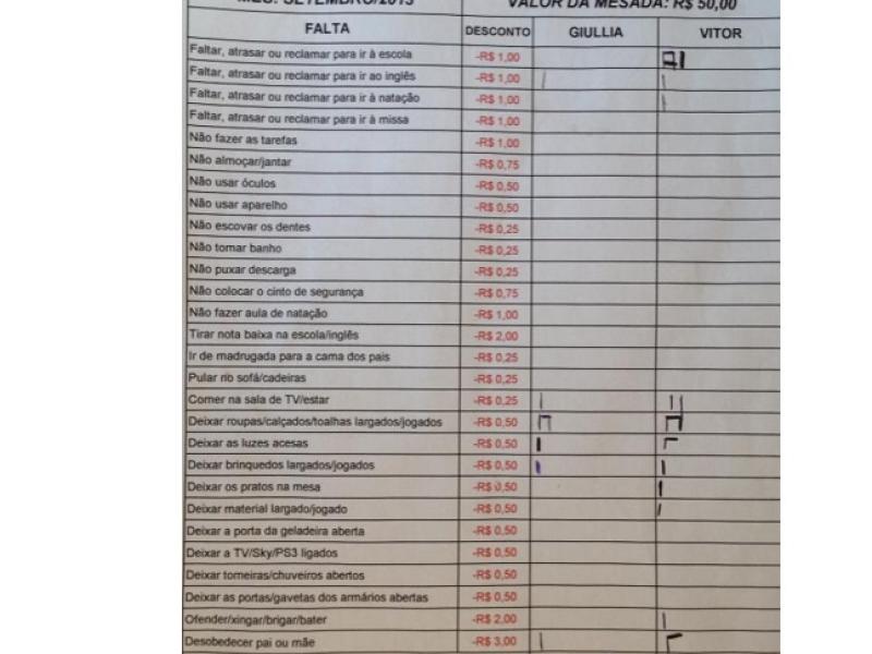 A imagem, publicada no dia 7 deste mês em seu perfil, já teve quase 100 mil compartilhamentos. Ela mostra como é feita a administração da mesada de R$ 50, distribuída mensalmente para cada filho. O método desconta entre R$ 0,25 e R$ 3 de cada “desobediência” feito durante o mês, que pode ser desde reclamar de ir para a escola até desobedecer aos pais.