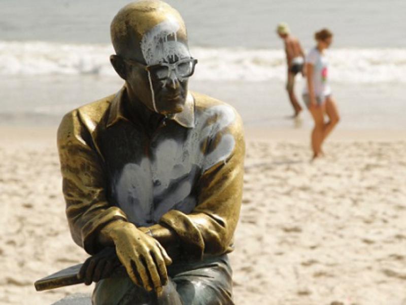 Casal picha estátua de Drummond na orla de Copacabana, (Vídeo)