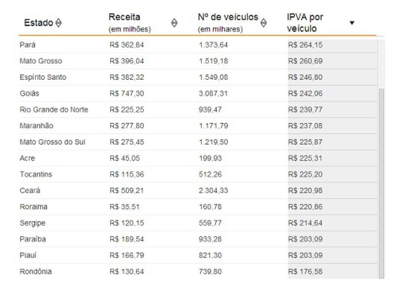 As alíquotas do IPVA variam de Estado para Estado, e há mais de uma alíquota por Estado, além de descontos e outras regras variáveis. Por isso, a receita por veículo permite uma comparação mais precisa da carga da carga do imposto.Veja o ranking clicando nas fotos abaixo. (Fonte: Dinheiro público & Cia)