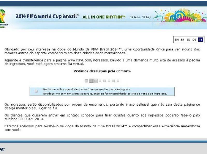 Além disso, a página da Fifa te oferece um alerta sonoro para quando você entrar na página de compra. Assim, o internauta pode continuar navegando na web sem precisar ficar olhando o site carregar. Antes mesmo de completar 20 minutos da abertura do site, os torcedores brasileiros, via redes sociais, já reclamavam da lentidão do serviço.