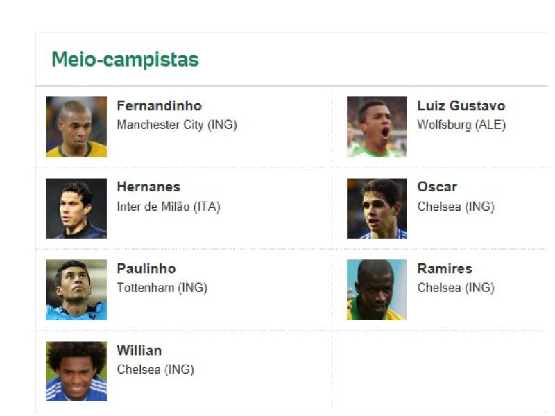 A briga mais acirrada estava no meio-campo. Paulinho, Oscar, Ramires e Willian já tinham convocação confirmada por Felipão e Luiz Gustavo estava praticamente garantido. Restavam duas vagas para cinco candidatos. E foram preenchidas por Fernandinho, que conquistou sua vaga com a boa atuação contra a África do Sul, e Hernanes. Já Lucas Leiva, Lucas e Jadson, chamados em outras oportunidades, ficaram pelo caminho.