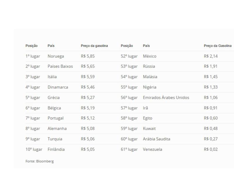 De acordo com o levantamento “Pain at the Pump: Gasoline Prices by Country”, realizado pela Bloomberg, o Brasil aparece na 39ª colocação, com o litro da gasolina saindo, em média, por R$ 3,20.
