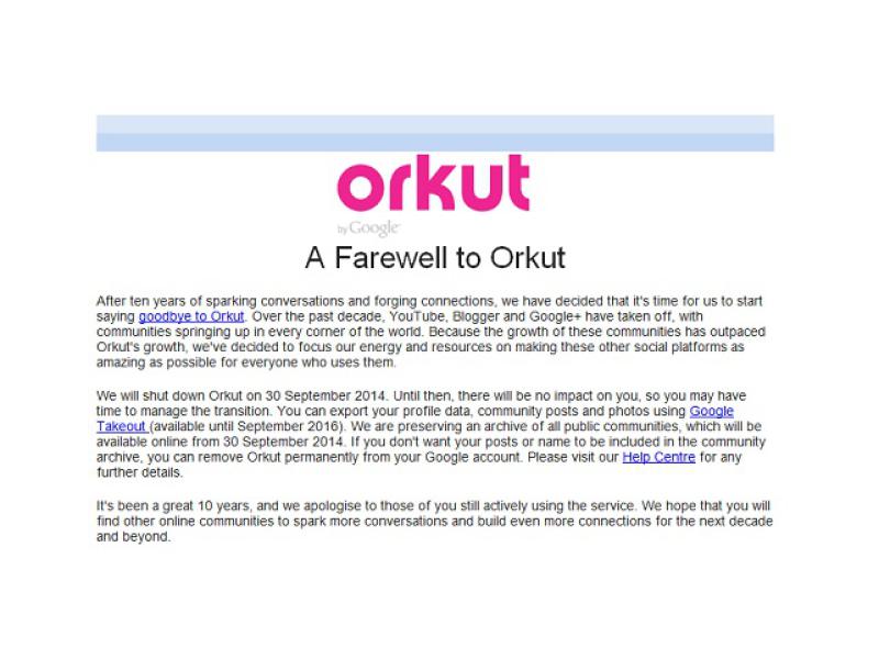 A empresa anunciou que o Orkut será descontinuado no dia 30 de setembro desde ano, sendo que a partir desta segunda-feira (30), não será mais possível criar novas contas. Apesar de o Orkut estar próximo do fim, todas as comunidades ficarão disponíveis em um arquivo online.