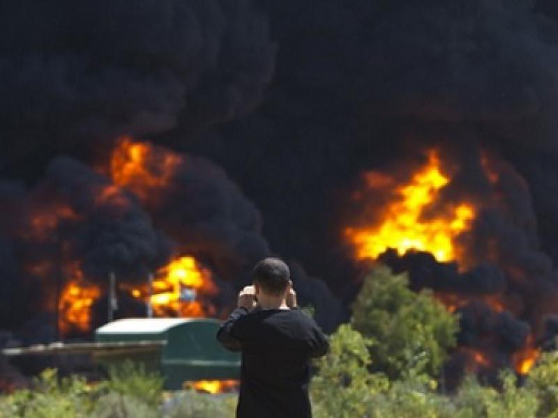 Uma grossa coluna de fumaça emergia das instalações, que suprem dois terços das necessidades de energia do território, e os contêineres de combustível estavam em chamas.