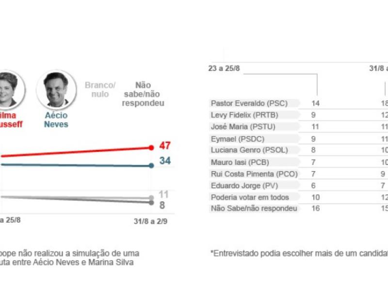 O Datafolha ouviu 10.054 eleitores em 361 municípios. A pesquisa, encomendada pela TV Globo e pelo jornal "Folha de S.Paulo", foi realizada entre os dias 1º e 3 de setembro e está registrada no TSE sob o número 00517/2014. O nível de confiança é de 95%. Isso significa que, se forem realizados 100 levantamentos, em 95 deles os resultados estariam dentro da margem de erro de dois pontos prevista. (Fonte: G1)