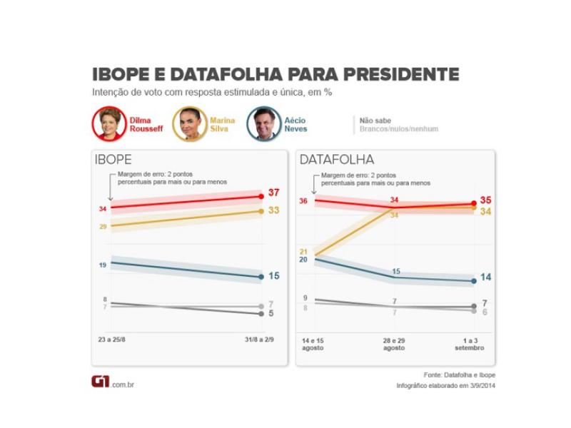 No Ibope, Dilma tem 37%, Marina, 33%, e Aécio Neves (PSDB), 15%. No Datafolha, Dilma tem 35%, Marina, 34%, e Aécio, 14%. Confira os números:
