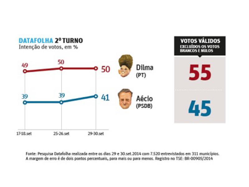 O Datafolha ouviu 7.520 eleitores em 311 municípios do país. A pesquisa, encomendada pela TV Globo e pelo jornal "Folha de S.Paulo", foi realizada entre os dias 29 e 30 de setembro e está registrada no TSE sob o número 00905/2014. O nível de confiança é de 95%. Isso significa que, se forem realizados 100 levantamentos, em 95 deles os resultados estariam dentro da margem de erro de dois pontos prevista. (Fonte: Thiago Reis/G1)