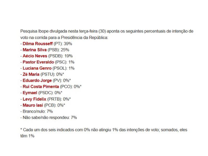 No Ibope, Dilma tem 39%, Marina, 25%, e Aécio, 19%. No Datafolha, Dilma tem 40%, Marina, 25%, e Aécio, 20%. Confira os números do Ibope: