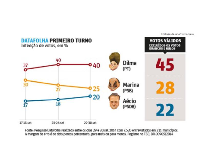 O Datafolha ouviu 7.520 eleitores em 311 municípios do país. A pesquisa, encomendada pela TV Globo e pelo jornal "Folha de S.Paulo", foi realizada entre os dias 29 e 30 de setembro e está registrada no TSE sob o número 00905/2014. O nível de confiança é de 95%. Isso significa que, se forem realizados 100 levantamentos, em 95 deles os resultados estariam dentro da margem de erro de dois pontos prevista. (Fonte: Thiago Reis/G1)
