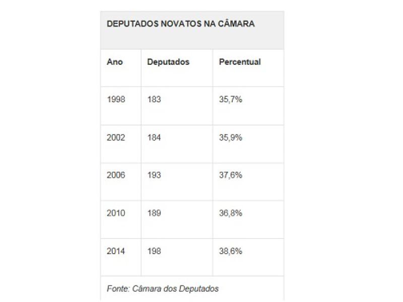 Até então, o maior índice de novos deputados na Câmara era o de 2006, quando 193 (37,6%), dos 513 deputados federais foram eleitos pela primeira vez. Na eleição de 2010, eram 189 (36,8%); em 2002, 184 (35,9%); e, em 1998, 183 (35,7%).