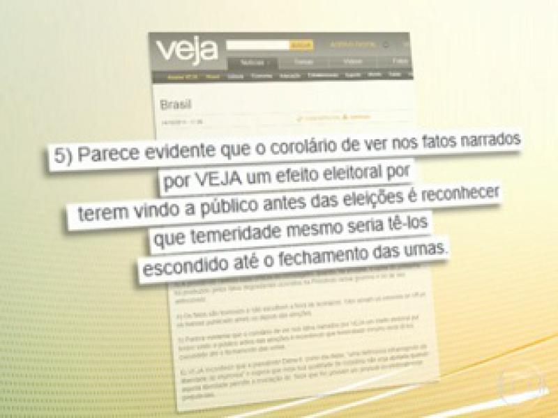 "No período eleitoral, compete a este Tribunal Superior velar pela preservação da isonomia entre os candidatos que disputam o pleito. Desse modo, ainda que a divulgação da Revista Veja apresente nítidos propósitos comerciais, os contornos de propaganda eleitoral, a meu ver, atraem a incidência da legislação eleitoral, por consubstanciar interferência indevida e grave em detrimento de uma das candidaturas.”, escreveu o ministro na decisão. (Fonte: G1)