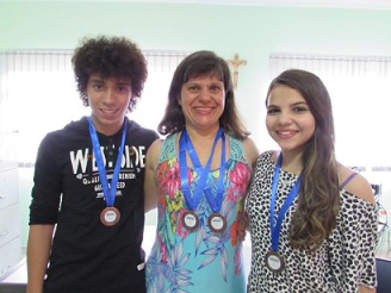 A professora Jaqueline Suzana Martin e os alunos Sarah Leme Lisboa e Thômas Gabriel Barbieri do Prado receberam medalhas e vales-compra de livros pela conquista do bronze