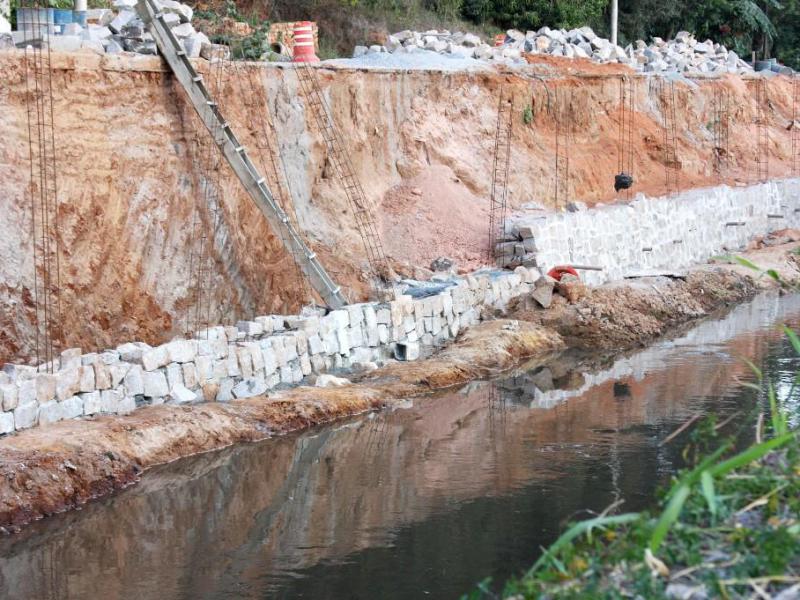 Continuam, já em fase avançada, as obras do novo muro de contenção do Ribeirão Jacaré em área próxima à ponte da Avenida Nossa Senhora das Graças