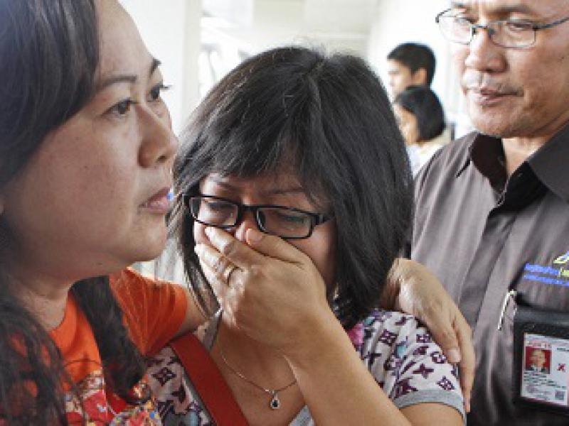 Familiares das 162 pessoas que viajavam no avião se abraçaram e choraram em Surabaia, de onde o avião decolou rumo a Cingapura, ao ver pela televisão as imagens de um corpo flutuando no mar.