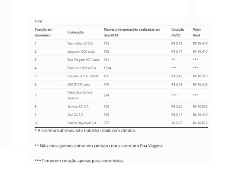 A reportagem fez um levantamento da cotação com as 10 casas de câmbio que, de acordo com o Banco Central, possuiram o menor VET
