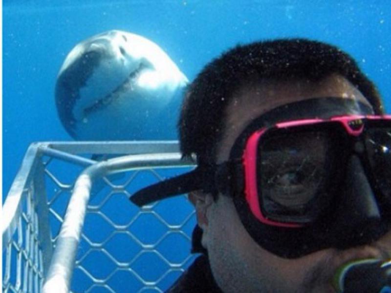 Britânico Gareth Brown publicou imagem no Twitter. Ele fazia mergulho em gaiola de proteção quando fez a selfie