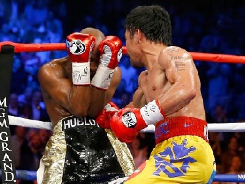 O duelo começou como esperado, com Pacquiao tomando a iniciativa e Mayweather buscando encaixar os contragolpes. Mas houve pouco contato entre os lutadores no primeiro round.