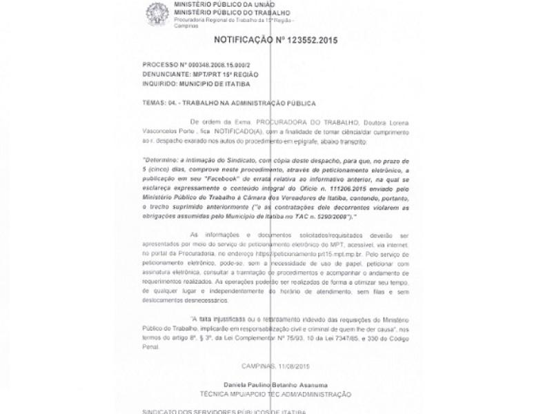 A notificação do MPT data de 11 de agosto e, no documento, o Sindicato é intimado a no prazo de 5 dias postar “uma errata relativa ao informativo anterior, na qual se esclareça expressamente o conteúdo integral do Ofício n. 111206.2015 enviado pelo Ministério Público do Trabalho à Câmara dos Vereadores de Itatiba” – diz o texto da procuradora."