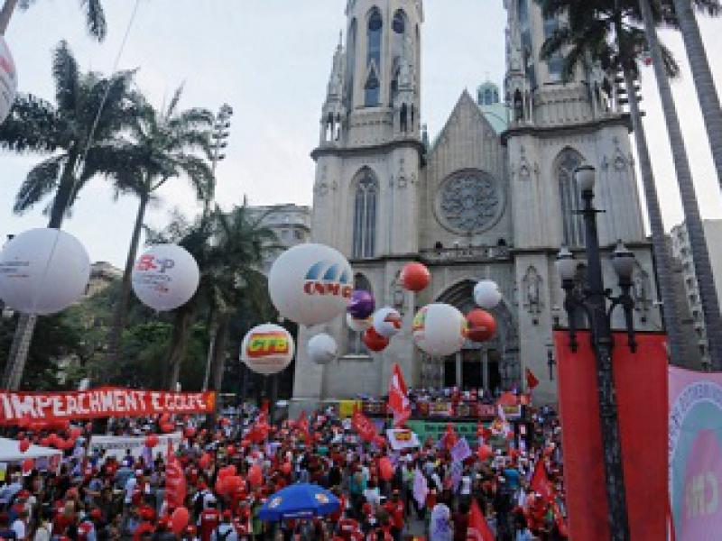 praça da Sé, no centro de São Paulo(SP), em protesto contra o impeachment da presidente Dilma Rousseff, segundo os organizadores do ato. A convocação para a manifestação foi feita pela Frente Brasil Popular, formada por movimentos sociais e centrais sindicais, e pela Frente Povo Sem Medo, liderada pelo MTST (Movimento dos Trabalhadore Sem-Teto) e que engloba cerca de 30 movimentos sociais.(Fonte: UOL)