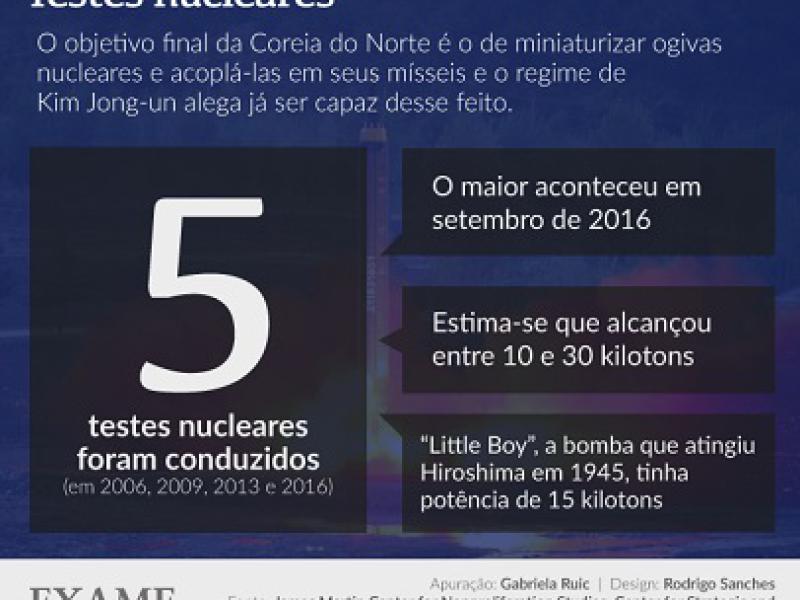 A crise nuclear da Coreia do Norte está se consolidando como um dos maiores desafios militares e diplomáticos dos últimos anos. Para entender a complexidade desse problema, a reportagem investigou os testes balísticos e nucleares já realizados pelo regime e produziu o infográfico abaixo." (Fonte: Gabriela Ruic/Exame.com)
